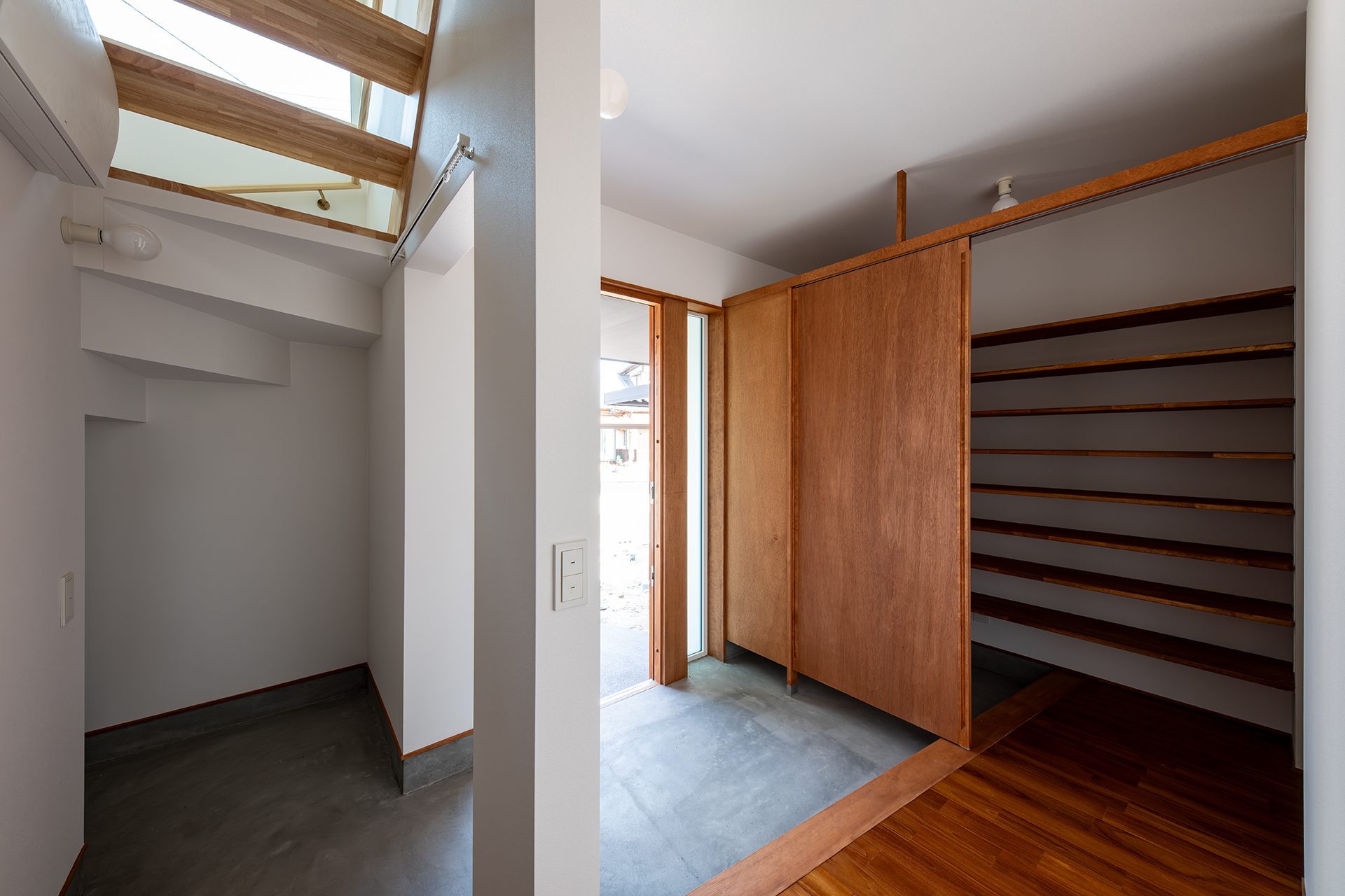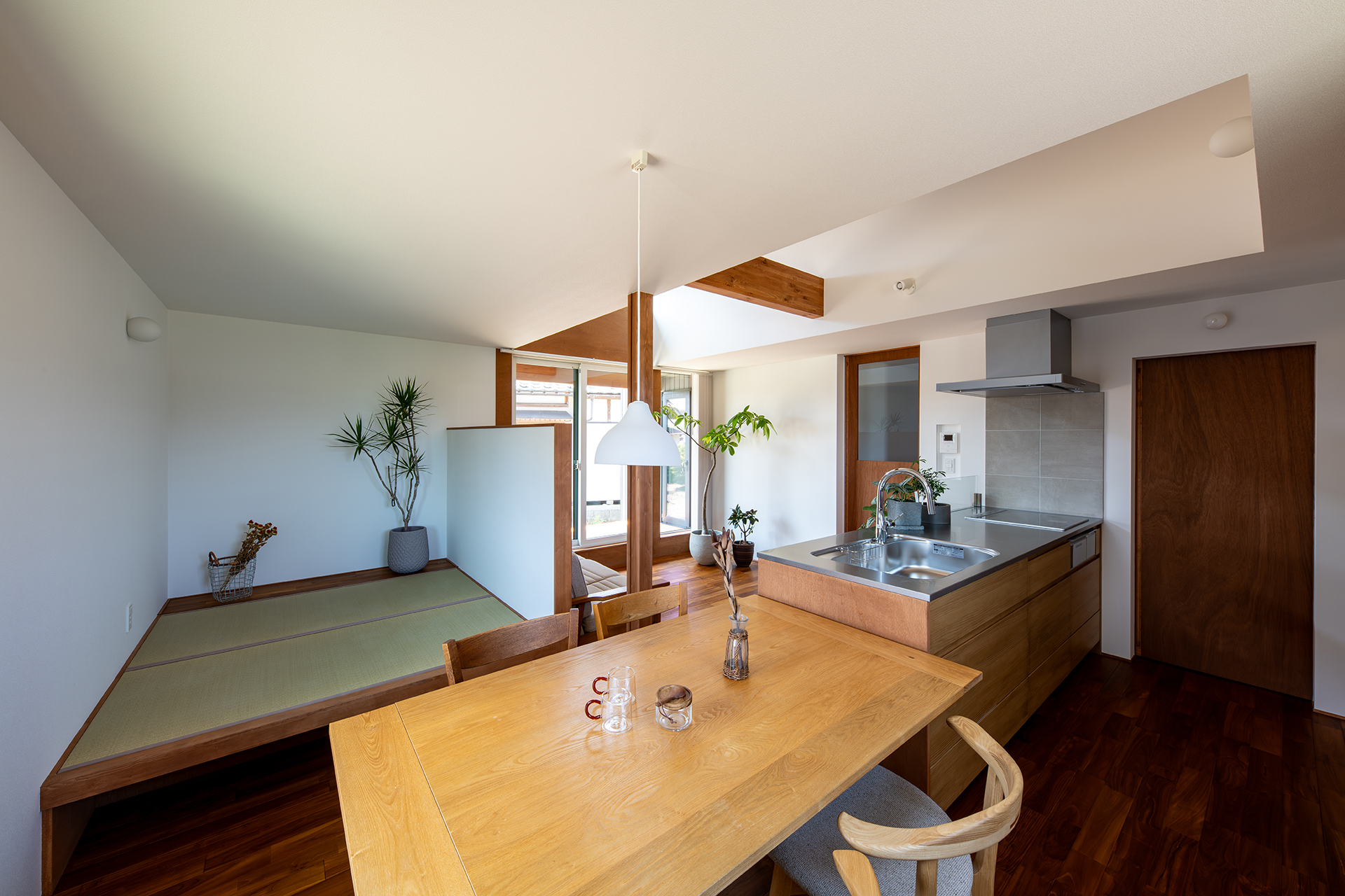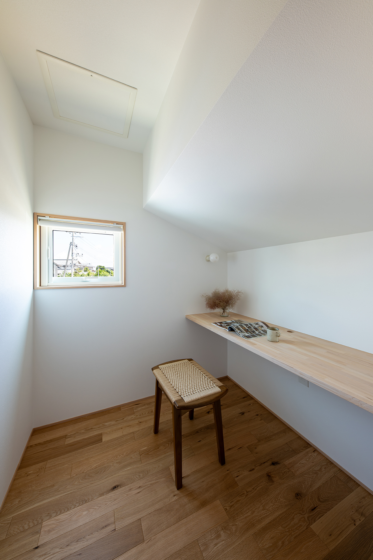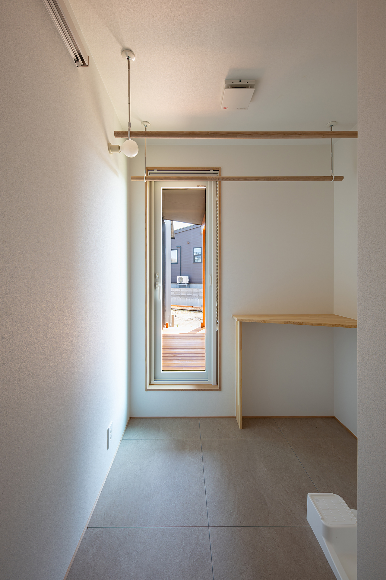 郊外で大らかに暮らす【横越の家】 2025.10.31 玄関から入って左にたっぷり収納のシューズクローク。奥にはパントリーが続き、買い物帰りの動線がスマートに。 シューズクロークの反対側は、階段下のスペースを活かした土間収納。夏の間は冬タイヤを仕舞っておける。 子供達の服などを収納できるファミリークロークを玄関に設けることで、外出準備の時間を短縮。 洗濯物は、干して畳むを省スペースで完結。デッキに出て外干しするのも簡単な家事動線。 洗面台には深型のシンクを採用し、赤ちゃんの沐浴もできる。 オープンキッチンの正面にベニアを貼ることで、既製品感を薄め、シンプルでありながら部屋全体にも馴染んでいる。 陽の光が入りづらい廊下にも明かりを通すため、リビングに繋がる扉には窓を造作。 南向きのリビングは大きな窓と、デッキの上からも高窓で採光。 ダイニングテーブル脇の窓は近くの川や山を借景し、食事に彩りをもたらす。 リビング奥の小上がりは下に収納を設け、子供が遊んだ後におもちゃを仕舞うことができる。 2階の子供部屋は床にオーク材を採用。子供の成長に合わせて部屋を仕切ることができる。 書斎は省スペースを生かしながら、立っても天井に上がらない高さを確保。 物件情報 所在地 新潟市江南区 家族構成 夫婦+子供1人 敷地面積 325.9㎡(98.60坪) 延床面積 94.21㎡(28.50坪) 設計:株式会社 加藤淳設計事務所