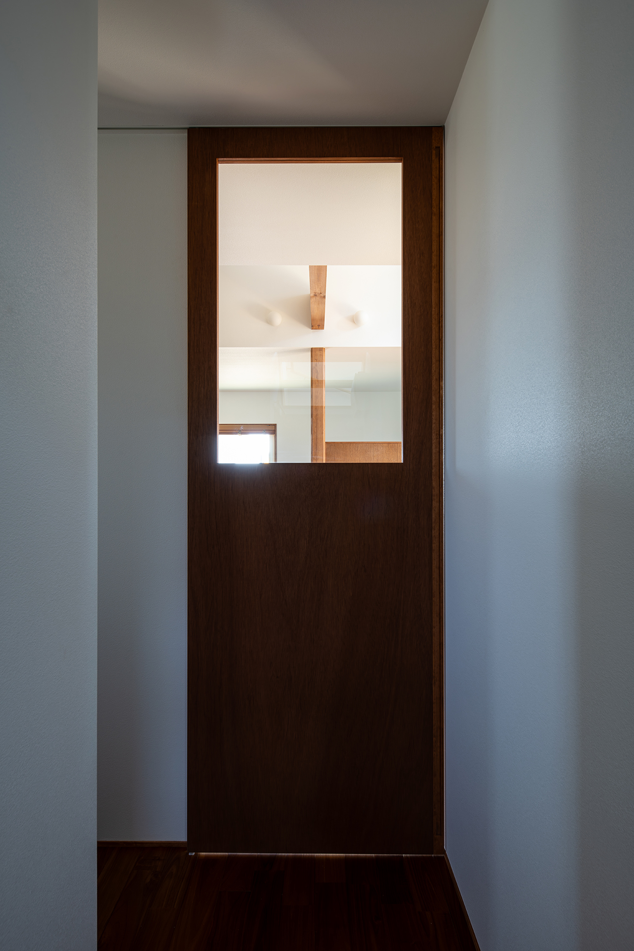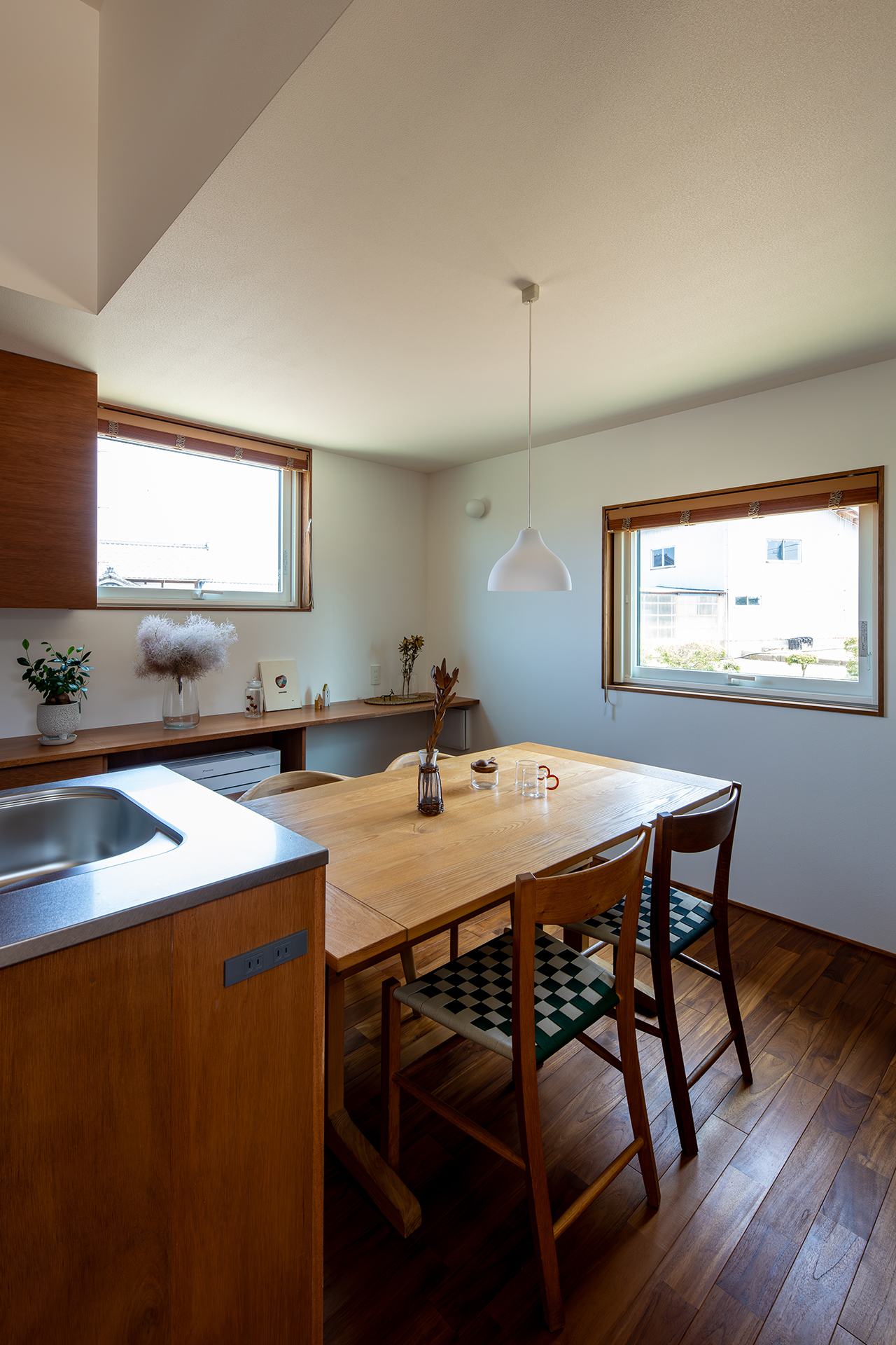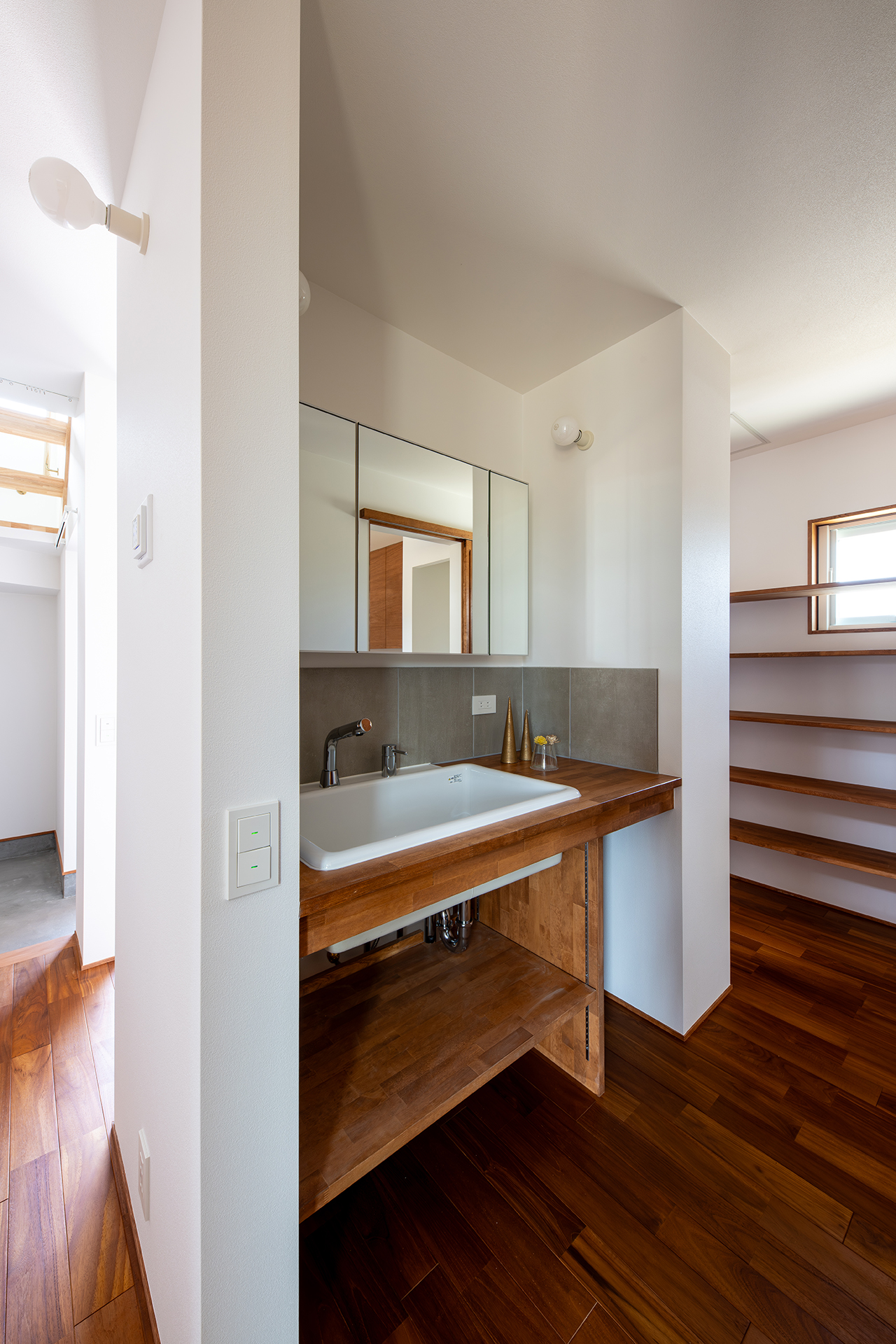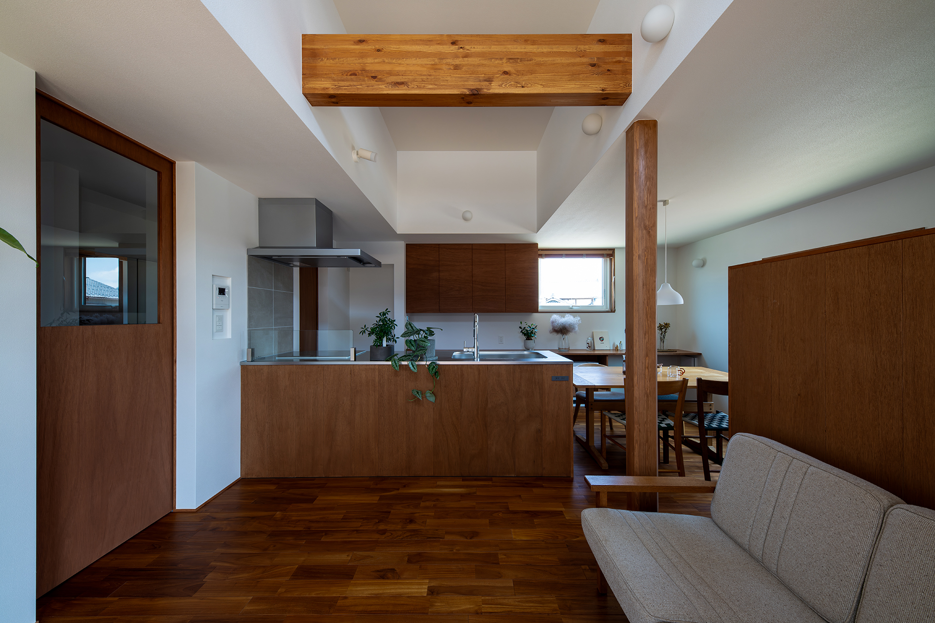 郊外で大らかに暮らす【横越の家】 2025.10.31 玄関から入って左にたっぷり収納のシューズクローク。奥にはパントリーが続き、買い物帰りの動線がスマートに。 シューズクロークの反対側は、階段下のスペースを活かした土間収納。夏の間は冬タイヤを仕舞っておける。 子供達の服などを収納できるファミリークロークを玄関に設けることで、外出準備の時間を短縮。 洗濯物は、干して畳むを省スペースで完結。デッキに出て外干しするのも簡単な家事動線。 洗面台には深型のシンクを採用し、赤ちゃんの沐浴もできる。 オープンキッチンの正面にベニアを貼ることで、既製品感を薄め、シンプルでありながら部屋全体にも馴染んでいる。 陽の光が入りづらい廊下にも明かりを通すため、リビングに繋がる扉には窓を造作。 南向きのリビングは大きな窓と、デッキの上からも高窓で採光。 ダイニングテーブル脇の窓は近くの川や山を借景し、食事に彩りをもたらす。 リビング奥の小上がりは下に収納を設け、子供が遊んだ後におもちゃを仕舞うことができる。 2階の子供部屋は床にオーク材を採用。子供の成長に合わせて部屋を仕切ることができる。 書斎は省スペースを生かしながら、立っても天井に上がらない高さを確保。 物件情報 所在地 新潟市江南区 家族構成 夫婦+子供1人 敷地面積 325.9㎡(98.60坪) 延床面積 94.21㎡(28.50坪) 設計:株式会社 加藤淳設計事務所