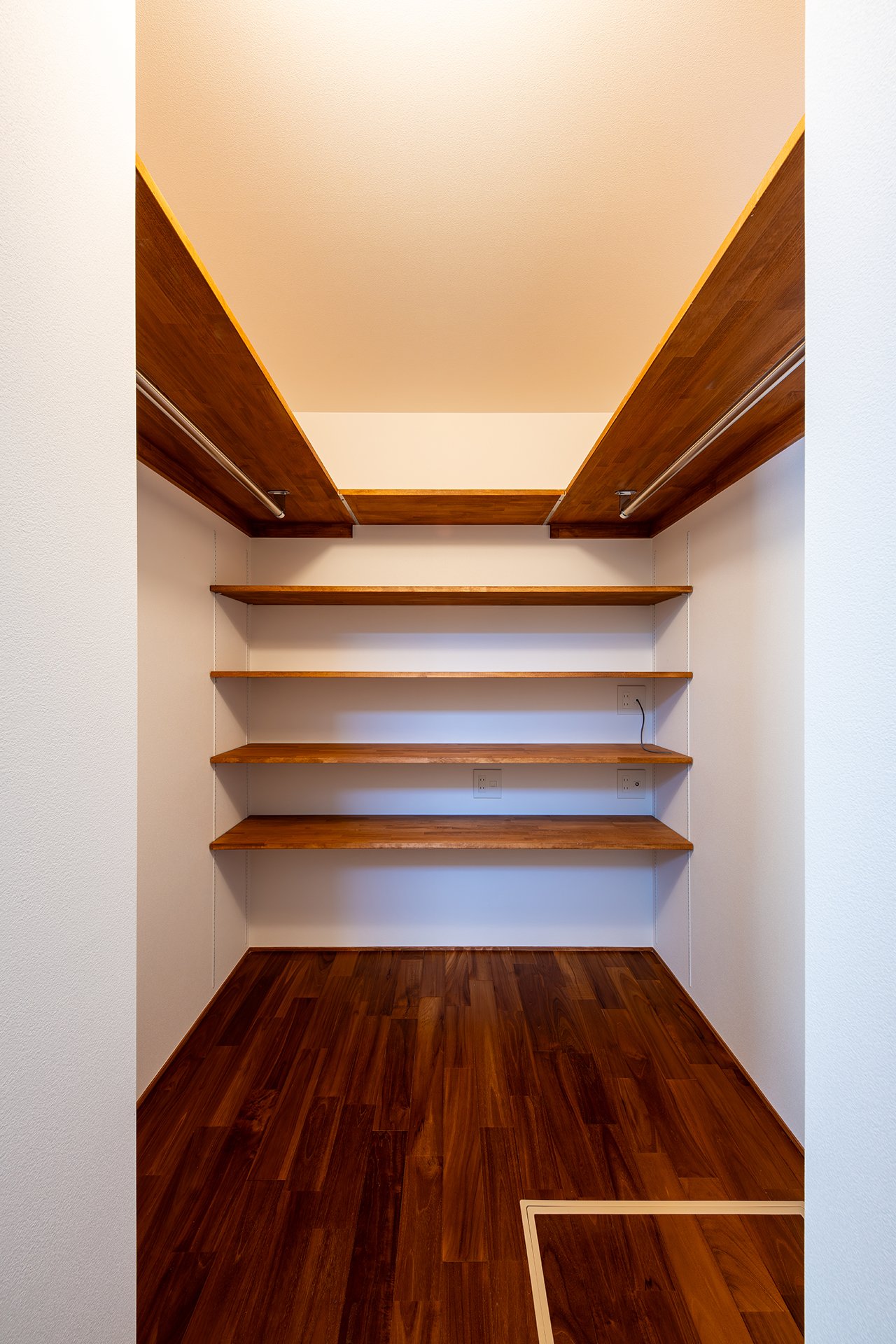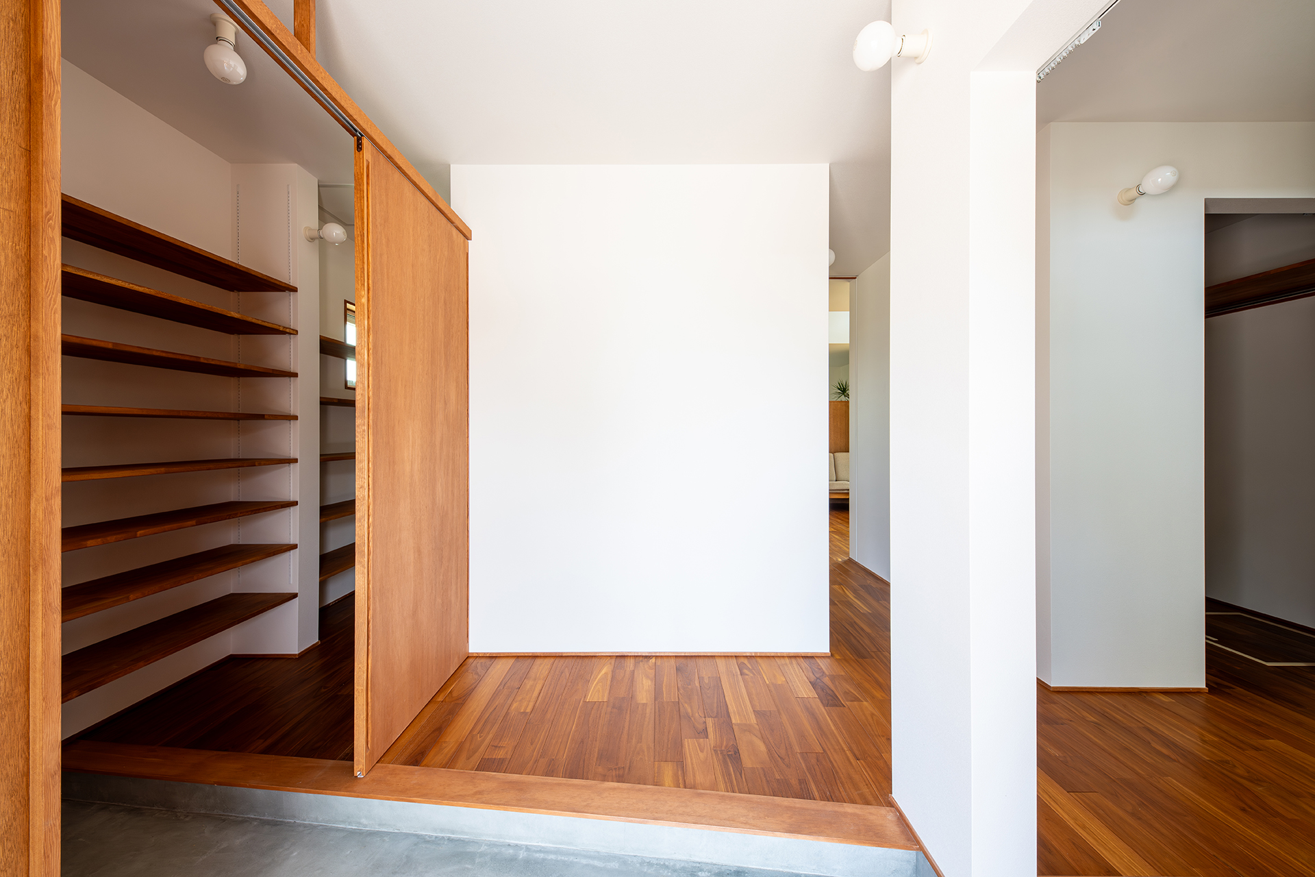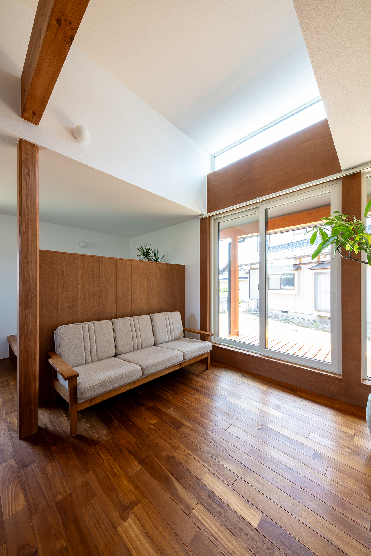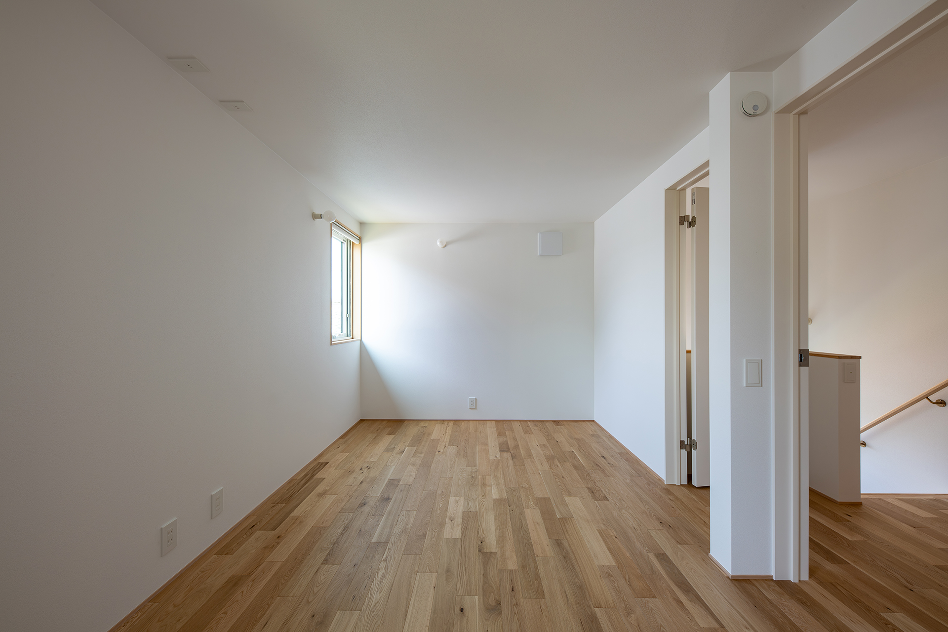 郊外で大らかに暮らす【横越の家】 2025.10.31 玄関から入って左にたっぷり収納のシューズクローク。奥にはパントリーが続き、買い物帰りの動線がスマートに。 シューズクロークの反対側は、階段下のスペースを活かした土間収納。夏の間は冬タイヤを仕舞っておける。 子供達の服などを収納できるファミリークロークを玄関に設けることで、外出準備の時間を短縮。 洗濯物は、干して畳むを省スペースで完結。デッキに出て外干しするのも簡単な家事動線。 洗面台には深型のシンクを採用し、赤ちゃんの沐浴もできる。 オープンキッチンの正面にベニアを貼ることで、既製品感を薄め、シンプルでありながら部屋全体にも馴染んでいる。 陽の光が入りづらい廊下にも明かりを通すため、リビングに繋がる扉には窓を造作。 南向きのリビングは大きな窓と、デッキの上からも高窓で採光。 ダイニングテーブル脇の窓は近くの川や山を借景し、食事に彩りをもたらす。 リビング奥の小上がりは下に収納を設け、子供が遊んだ後におもちゃを仕舞うことができる。 2階の子供部屋は床にオーク材を採用。子供の成長に合わせて部屋を仕切ることができる。 書斎は省スペースを生かしながら、立っても天井に上がらない高さを確保。 物件情報 所在地 新潟市江南区 家族構成 夫婦+子供1人 敷地面積 325.9㎡(98.60坪) 延床面積 94.21㎡(28.50坪) 設計:株式会社 加藤淳設計事務所